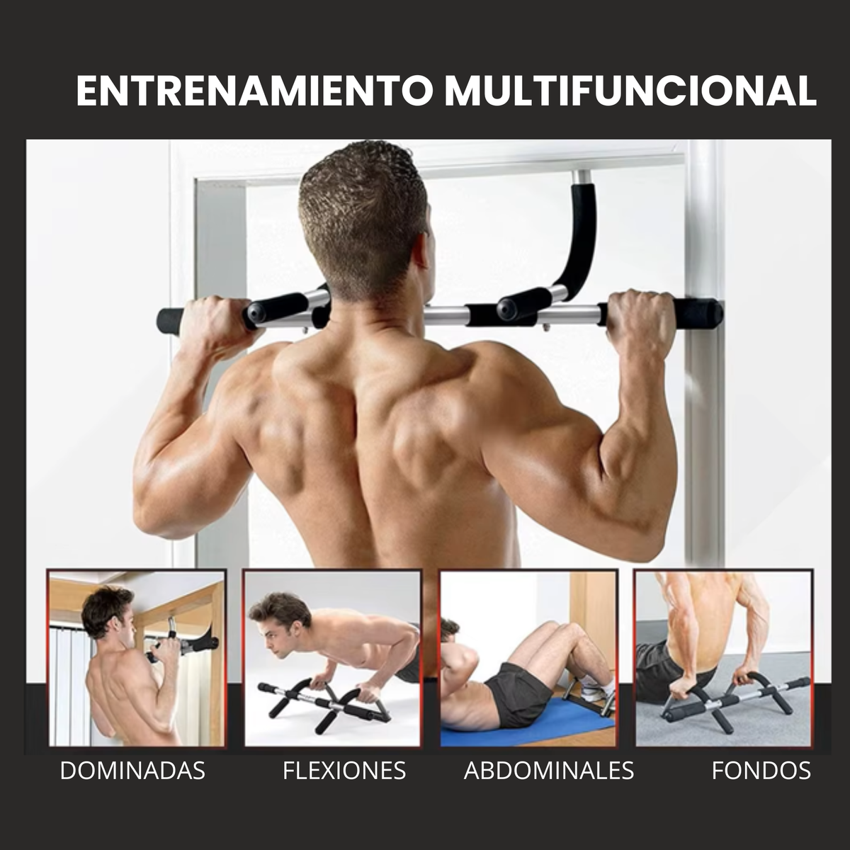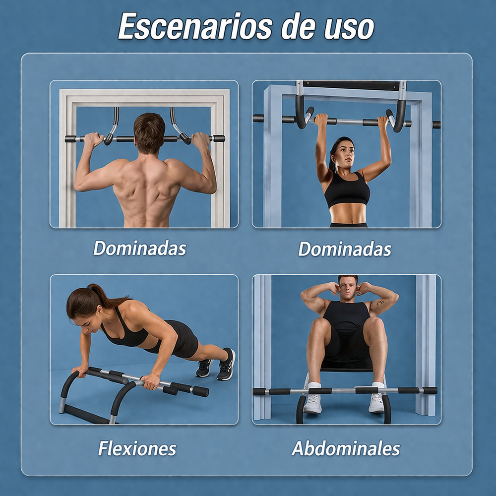 Transforma cualquier puerta en tu gimnasio personal sin herramientas ni daños. Entrena tu espalda y brazos con la seguridad del acero reforzado y recupera tu forma física sin salir de casa.